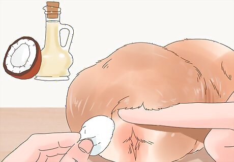 Clean the grease gland with coconut oil. The grease gland is located on your guinea pig’s rear end where the tail should be. Squeeze a small amount of coconut oil onto a cotton ball. Rub the grease gland with the cotton ball for 30 seconds to a minute to loosen up the grease. Once the grease is loose, use a clean cotton ball to wipe it away. Rinse the area with clean water. Male guinea pigs tend to have more grease than female guinea pigs.