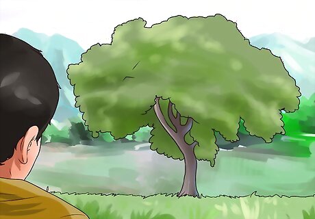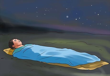 Choose a good spot to sleep. An area that is level and cleared of rocks and sticks might be a good place to lay your mat. However, if you don't have a pad and just have blankets or are without those too, finding a place beside a tree, wall or on a slab of rock would work better. These places can give you somewhere to prop your head up. Trees provide shade and possibly even fruit, so they can be a good place to sleep. Always check the branches above you and make sure none are dead or dying so they won't fall on you while you sleep. A pine tree is an ideal place to sleep under. The old needles and twigs that have fallen over the years can be soft and very insulating. While grassy areas can seem inviting, they can encourage condensation to form overnight. If you find a cave, it can be a good place to get out of the elements but always watch out for animals.