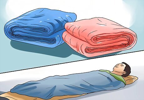 Get a sleeping bag. Sleeping bags are popular and can be very useful when you need to sleep on the ground. Make sure to purchase a sleeping bag rated for the temperature range you will be sleeping in. Bags meant for camping usually offer more room but are less efficient for retaining heat, so if you will be in a very cold location you should consider a sleeping bag meant for backpacking instead. If you're camping with another person, consider a sleeping bag that can fit 2 people for extra insulation and warmth. You can also use 2 sleeping bags for yourself or 2 people. Open your first sleeping bag and lay it flat. You can put a sheet over it if you want and then open the other sleeping bag to use as a blanket. A removable sleeping bag liner can help keep your sleeping bag cleaner if you will be using it for several nights. If it rains or snows, you will probably need to sleep in your sleeping bag inside a tent, vestibule or other makeshift cover for protection.