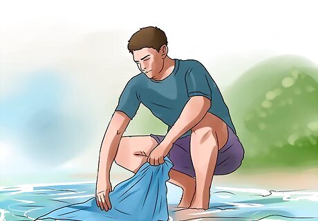 Wash and air out blankets and clothes. If you will be sleeping outside for a while, then you will want to keep your clothes and bedding clean and dry. You can rinse material in a river and leave it to dry on a branch. Every morning, allow your blankets and clothes to air out so that any moisture that collects overnight can dry out.