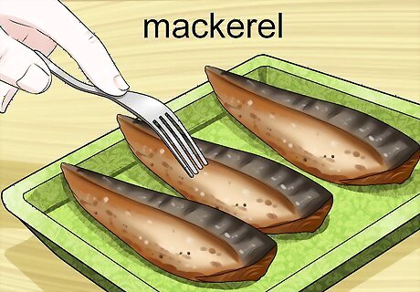 Make room for mackerel in your diet. You will get about 1,500 miligrams of omega-3 fatty acids in a three ounce portion of cooked mackerel. Alongside salmon, lake trout, herring and sardines, mackerel is one of the fish with the highest concentrations of omega-3 fatty acids. When preparing the mackerel, you should try to bake or broil it because it is healthier than deep frying. There are lots of ways to enjoy mackerel, which is an oily and meaty fish: Eat smoked mackerel on toast for breakfast. Prepare a whole mackerel for a dinner party. If you are shopping, look for a mackerel with glistening skin and bright eyes, which indicates freshness.
