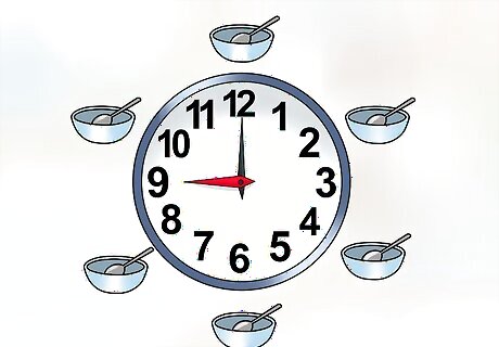 Eat small meals, throughout the day. Rather than gorging at the end of the day, you should nibble on small meals throughout the day. This habit will keep your blood sugar levels steady and give you consistent energy, while ensuring that you get adequate calories.