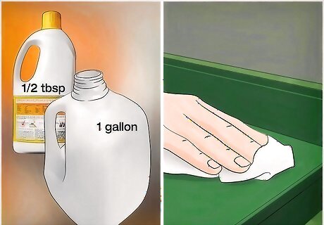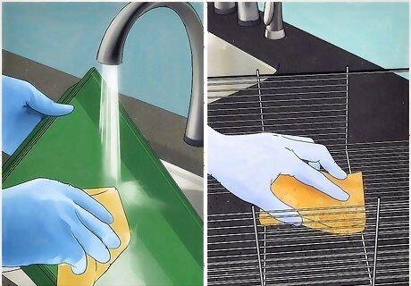 Disinfect the cage and its accessories. To disinfect, mix 1/2 tablespoon of bleach per 1 gallon of cold water. Put some of this solution in a spray bottle and spray the inside and outside of your mouse’s cage. You can either wipe the cage dry after 2 minutes or let it air dry. For the cage accessories, add the bleach solution to another bucket and let the accessories soak for about 30 seconds. Let them air dry before putting them in the cage. When cleaning and disinfecting your mouse’s cage, you should not be able to smell the cleaning agent.