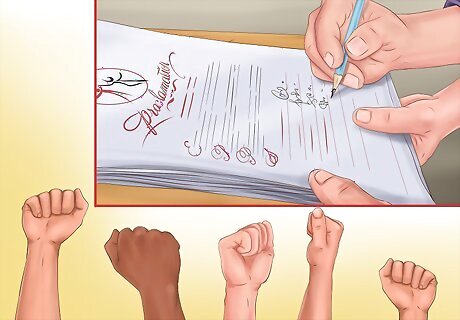 Exercise your ability to assemble and petition the government. The first amendment also provides citizens the ability to join organizations aimed at political change, peacefully protest in public, and communicate their grievances to federal, state, and local governments. While the government does not have to respond to each of these communications, you have the right to make your voice heard either by yourself or as part of a group.