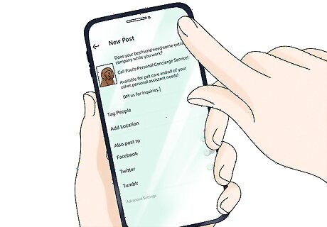 Use social media to attract customers. Social media is one of the best ways to advertise your new business because you can easily reach a wide audience and it’s free. Set up accounts for your business on popular sites like Instagram, Twitter, and LinkedIn. Make sure to include important information like how to contact you and what services you provide in your bio. Keep your posts professional and positive. Try an Instagram post that is a photo of a dog with the caption, “Does your best friend need some extra company while you work? Call Paul’s Personal Concierge Service! Available for pet care and all of your other personal assistant needs!”
