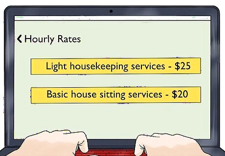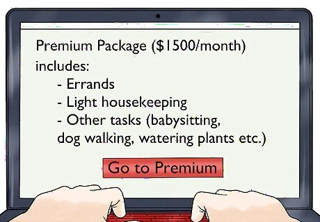 Offer monthly rates for regular clients. You may attract clients that want to take advantage of many of your services on a regular basis. In this case, you will both probably find it easier if they pay a flat monthly fee rather than billing them by the hour. You can determine a maximum number of hours that you will work and make that part of the agreement. Make it clear on your website what a monthly rate includes. For example, you could advertise a "Premium Package" that includes weekly errands, light housekeeping, and other tasks for $1500.