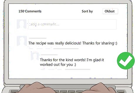 Engage your fans on social media. Create accounts on the most popular social media sites like Instagram, Twitter, and Pinterest. Always post a link when you create new content on the blog and interact with fans and followers. The more that you interact with people, the more likely they will continue following you and checking back for your content. For instance, if someone says that a recipe was really delicious, you could leave a reply like, "Thanks for the kind words! I'm glad it worked out for you."