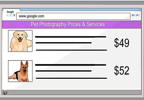 Decide how much to charge. Review the price range for professional photography in your area, including other pet photographers. This will help you get a rough range of the amount people are willing to pay for professional photographs. If you're starting out, charging a little less than the competition can help. In addition to charges for photographs, think about any extra charges that may be fair. This ensures you'll make a profit. For example, if you shoot outdoors, have clients reimburse you for gas if they want photographs taken in far away locations.
