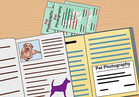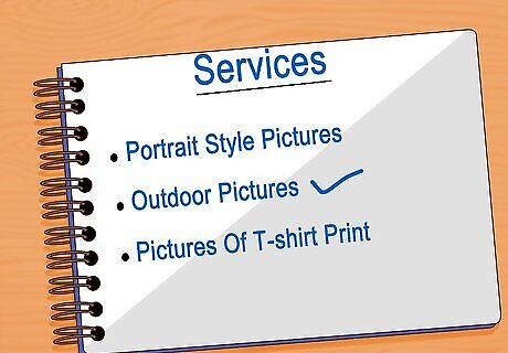 Figure out the kind of pictures you'll take. As you start establishing your business, it's important to narrow down exactly the type of services you're providing. Decide if you're providing portrait style pictures or outdoor shots and any extra services. Narrowing down the services you're going to provide is often a matter of determining your capabilities. If you don't have a room in your home with solid lighting, for example, you should probably advertise yourself as someone who takes outdoor photos of pets. Do you have any special skills? If so, find a way to use them to entice customers. For example, if you know printmaking, offer to print t-shirts with people's pets on them.