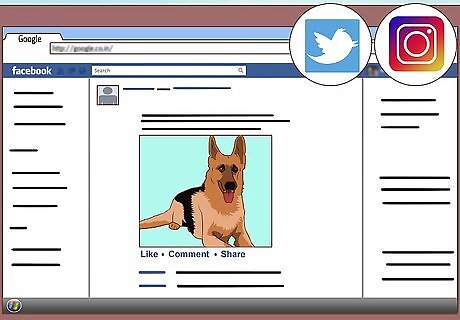 Develop a social media presence. Create various social media accounts, such as a Twitter, Facebook, and Instagram account, for your business. Use these to promote your brand and post relevant content, such as any recent pictures from photo shoots. Be consistent about posting. The more you post, the more likes and shares you'll get, resulting in a bigger social media following. If you notice some of your photos getting positive attention online, try taking them around to local businesses and seeing if they want to feature some of your work. For instance, you might visit a vet clinic or a doggy day care and ask them if they have a bulletin board where you can put up a flyer or a business card. Keep your brand in mind when posting. If you're advertising yourself as a fun and quirky business, for example, post goofy content, like funny memes of animals.