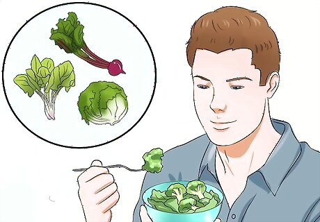 Eat leafy greens. One of the major staples of a raw vegan diet are leafy greens. You can use leafy greens for salads, in smoothies, or when juicing. Leafy greens include kale, spinach, Swiss chard, collard greens, beet greens, arugula, and lettuce.
