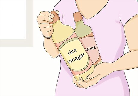 Store rice wine and rice vinegar. Both rice wine and rice vinegar are made by fermenting rice for a long period of time. Pay attention to recipes that call for rice wine or rice vinegar and use the correct liquid since they're not interchangeable. Rice vinegar is a mild, light vinegar that has a little sweetness to it. It's usually clear or reddish brown. Rice wine does have a low alcohol content and it gives a slightly sweet flavor to foods. Sake, mirin, and Shaoxing are all popular types of red wine vinegar that will add depth of flavor to your Asian meals.