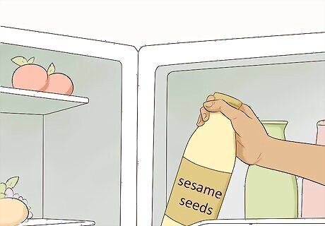 Store sesame seeds in the refrigerator. Sesame seeds are used to give foods a little crunch or to garnish a dish. You can use white or black sesame seeds, but you'll need to keep them in the refrigerator to prevent them from turning rancid. You could make honey sesame chicken or crispy sesame chicken with rice.