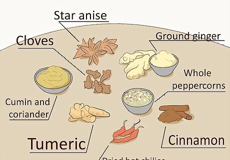 Store and rotate common Asian spices and herbs. Try to buy several ground, dried herbs and spices. Label the spices with the date that you purchased them and try to use them within 6 months. The flavor will fade over time, so replace them regularly. Common Asian spices and herbs include: Ground ginger Star anise Cloves Cumin and coriander Whole peppercorns Tumeric Cinnamon Dried hot chilies Five-spice powder