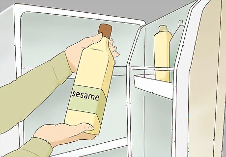 Store sesame oil in the refrigerator. Buy a small jar of dark, toasted sesame oil and use just a few drops to flavor a dish. Toasted sesame has a nutty, almost smoky flavor that you can add to your cooked food. Add a few drops to steamed broccoli or vegetable stir fries. Because it's a seasoning oil, avoid cooking food in the oil. You can store sesame oil in the refrigerator for about a year. If you store the oil at room temperature, it will become rancid.