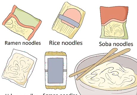 Buy a variety of noodles. You'll have a lot more flexibility in cooking Asian meals if you stock several kinds of noodles. These can be made from wheat, buckwheat, or rice. Some of these noodles should be boiled and used in a dish while others can be softened in cold water. For example, make Pad Thai with softened rice noodles. Try to buy: Ramen noodles Rice noodles Soba noodles Udon noodles Somen noodles