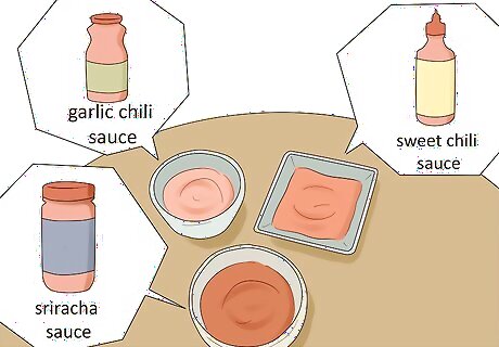 Get several types of chili sauce. A lot of Asian recipes can be made spicy. To get this heat, stir in a little chili sauce. You can buy garlic chili sauce, Thai sweet chili sauce, or sriracha sauce. If you're serving food to guests, consider setting out a small tray with different types of chili sauce so your guests can adjust their own flavors. You can keep the chili sauces stored at room temperature if you eat them within a month or two. For longer storage, keep them in the refrigerator.