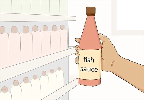 Buy a bottle of fish sauce. You can use fish salt in a lot of Thai or Vietnamese recipes. Fish sauce is made by fermenting fish with salt in water. The sauce itself is dark, salty, and very smelly, but it will add an important flavor to Asian recipes. Since the sauce is fermented you can store it in your pantry for up to 2 or 3 years. Oyster sauce is another sweet and spicy sauce that isn't quite as fishy as fish sauce. For a vegetarian oyster sauce, look for one that's made with mushrooms instead of oysters.