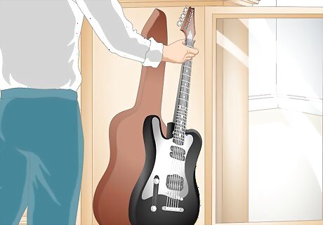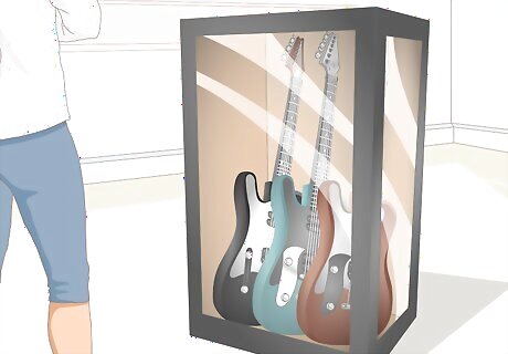 Stand your guitars upright in the cabinet in or out of their cases. Some guitar storage cabinets are designed only for guitars that aren’t in cases. If this is the case, place your guitar in the cabinet without a case. However, you might decide to leave your guitar in its case if you made your own cabinet or your cabinet can hold a case. Place the guitars upright inside the cabinet to store them. If you’re using a repurposed cabinet, leaving the guitars in their cases might be the easiest and safest way to store them, as the cases offer added protection.