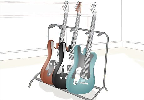 Use a guitar rack (or multi-stand) if you want to store multiple guitars. Guitar racks are often labeled as multi-stands because they hold more than 1 guitar. If you have multiple guitars, a guitar rack may be the best storage option for you. Pick a rack that’s big enough to hold all of your guitars. Then, place each guitar sideways on the rack in an even line. Keep in mind that guitars may bump into each other when they’re stored on racks. Be careful when placing the guitars on the rack or when moving the racks around. You can find stylish wooden guitar racks online if you want your rack to add to your decor.