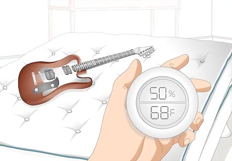 Use a humidity monitor to ensure the humidity stays between 45-55%. High humidity can warp the guitar, while low humidity can crack it. Purchase a humidity monitor at a home improvement store or online. Place it in the room where you keep your guitar so you can monitor the humidity level. Check the humidity often to make sure it stays in the range of 45-55%. If you’re in a high humidity area for a period of time, keep your guitar in its case. Once a day, remove the guitar from the case and blow dry the inside of the case for 10-15 minutes every day. Alternatively, keep silica pads in your guitar case to absorb the moisture. Change the pads out every few months as recommended on the package. If your area has low humidity, use a humidifier to add moisture to the air.