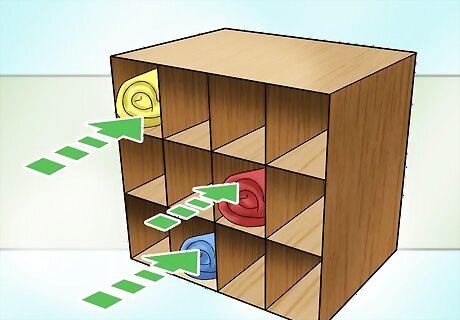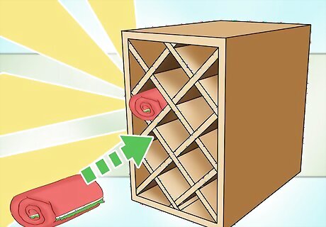 Roll up your scarves and store them in a wine rack. You can place one rolled up scarf into each wine cubby, or stash multiple scarves in each cubby if you have a big collection. Wine racks can also serve as a great decorative element for your bedroom or closet, since they come in tons cool of styles.