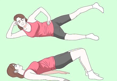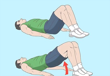 Engage your glutes with the bridge. Lie on your back with your knees bent and your feet flat on the floor. Engage your glutes and core to lift your hips toward the ceiling, resting your arms palm down on either side of your torso. Hold for 3 to 5 seconds, breathing deeply, then lower your body slowly to the floor. Aim for 10 to 15 repetitions of this exercise. Check that your body forms a straight line from your knees down to your shoulders when you are at the top of the bridge.