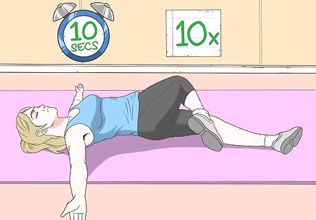 Progress to side planks. Lie on your side with your bottom forearm on the floor and your elbow directly under your shoulder. Lift your hips so that only the edge of your foot and your forearm are on the floor. Hold for 20 to 30 seconds, then release. Aim to do 5 to 10 repetitions at 20 to 30 seconds, breathing deeply. If you increase the time you hold the plank, you can do fewer repetitions. After you finish your reps, switch and do the other side. Keep your back neutral and avoid hunching your shoulders. Your top and bottom shoulder should be in alignment.