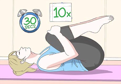 Hug your knees to open space in your spine. The lumbar flexion stretch will gently open up your spine and can bring you some relief. Lay on your back and bring your knees up to your chest slowly. Wrap your arms around your shins and hug your legs, opening up your back and spine. Hold for about 30 seconds, breathing deeply, then release your legs. Repeat the stretch 10 times if you can do so without pain. Stop if you find that your pain increases. You don't have to lay flat on the hard floor for this stretch. Lay on your bed or the couch, anywhere that's comfortable.