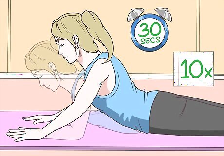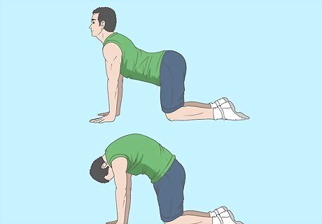Do the cat-cow stretch to increase spinal mobility. Start on all fours with your knees under your hips and your wrists under your shoulders. Breathe deeply. On an inhale, drop your stomach to the floor and arch your back, looking upward. On an exhale, lift your stomach up towards the ceiling, rounding your back, and tuck your chin down. Alternate between cat and cow for 10 repetitions with a breath for each movement, then take a short break. Do 2 to 3 sets of this exercise.