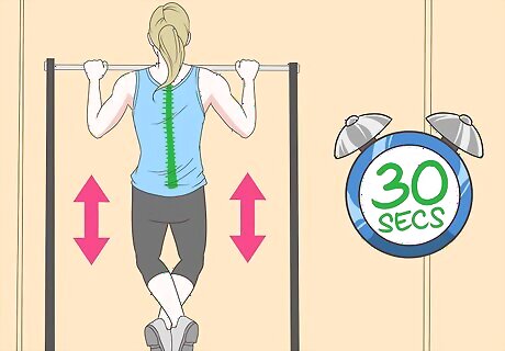 Hang to decompress your spine. Use a chin-up bar if you have access to one. You can also use the top of the door or anything you can comfortably grip and hang on. Reach up and allow your body to hang. Hold for 30 seconds, breathing deeply. You may want to place a step stool nearby. After 30 seconds, step up onto the stool. Then you can step off again and hang. Do 3 to 5 repetitions. If you find it uncomfortable to hang, or if it does nothing to decrease your pain, stop and do something else.