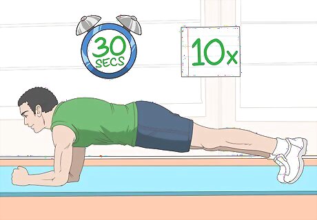 Start with planks. Lie flat on the floor with your forearms on the mat and your legs straight out behind you. Engage your core to lift your body until only your forearms and toes are on the floor. Keep your back neutral, shoulders rolled back. Hold for 20 to 30 seconds, then release to the floor. Engage your core and glutes and breathe deeply through this exercise. Try for 5 to 10 repetitions. You can also do fewer reps while holding the plank for longer.