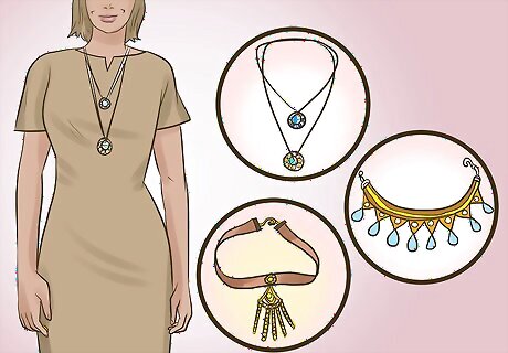 Wear complementary jewelry. Jewelry can go well with most outfits, including khaki. As khaki is often seen as more casual, sometimes dramatic jewelry works well. You can try something like a double pendant necklace, a heavily beaded choker, or a statement necklace. Lighter colored jewelry, like white or cream jewelry, looks great with khaki as it stands out a bit more against khaki's darker shades. This tends to show up more strikingly than gold or silver jewelry.