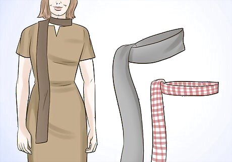 Throw on a scarf. A scarf is a versatile accessory that goes with any number of outfits. A scarf can be a great addition to a khaki dress even during the warmer months. Neutral colors tend to compliment khakis, so stick to colors like browns, grays, and blacks. As khaki is a solid color, a scarf can make things more interesting by adding a little pattern. Opt for a floral, checkered, plaid, or polka-dot scarf to add some flare.