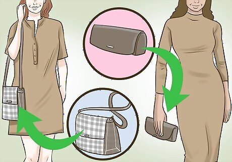 Carry a stylish purse. A khaki dress can pair well with a number of purses. Stick to neutrals, like grays and blacks, and choose a purse in a style you like. Account for the type of dress you're wearing. A small clutch purse would go well with a form-fitted khaki outfit while a larger, bulkier purse could pair with a casual off-the-shoulder dress. Like a scarf, a purse can be used to add patterns. Opt for, say, a checkered black and white purse to pair with a khaki dress.