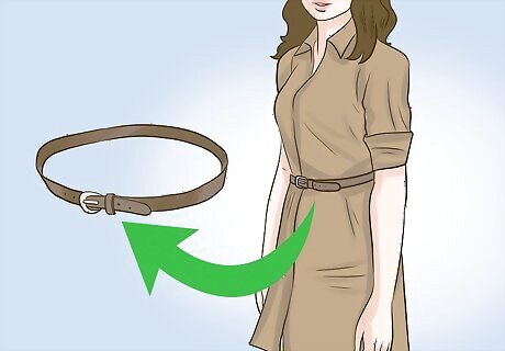 Define your waist with a belt. If your khaki dress is a little loose around the middle, cinch it at the waist with a belt. Not only will a belt highlight your figure, it can add some flare to a khaki dress. You can go for a skinnier belt or something thicker to accentuate your frame. Stick to colors like brown and black, which go well with khaki. A belt tied around a button-down khaki dress adds a professional feel.