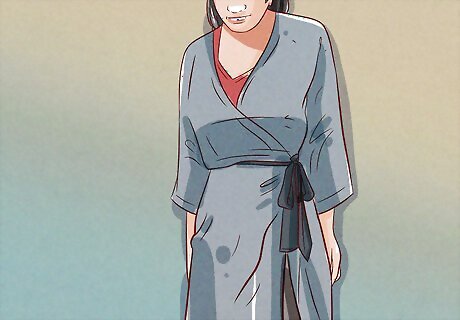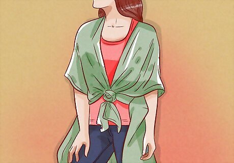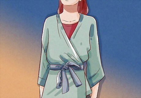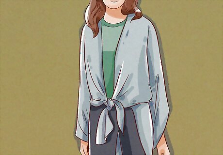 Tie the kimono to 1 side to add interest to your outfit. Locate the ties on your kimono – these tend to be around the waist area or inside the kimono. Knot the ties together and then swivel the kimono to 1 side of your body so that the knot is off-centre. If your kimono doesn't have a tie, simply choose a piece of rope or ribbon that is a similar colour and wrap it around the robe.