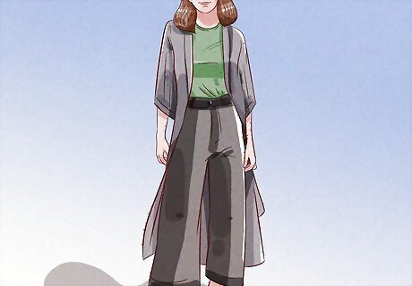 Wear a long kimono with wide leg pants for a high fashion look. This loose, oversized style is an on-trend streetwear look. Opt for a loose fitting kimono jacket to match the loose pants. If you want to add a little shape to the outfit, simply do up the ties on the front of the kimono. If you are feeling particularly bold, choose a kimono that is the same colour as your wide leg pants. This would be a great outfit for a fashionable dinner.