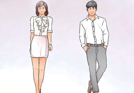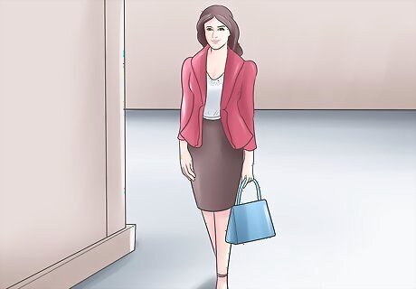 Be well groomed and well put together. Present a clean, fresh professional appearance by being well groomed and smartly put together. For men, that means clean shaven, with well groomed hair and no dangling or heavy jewelery. For women, that means a sleek updo or a low ponytail and nails that are neat and well groomed. Women should wear clean, simple makeup that includes blush, mascara, and lipstick. Do not put on any elaborate or heavy makeup and keep your accessories minimal, with stud earrings and a small watch. You can finish your look with a simple necklace or a scarf.