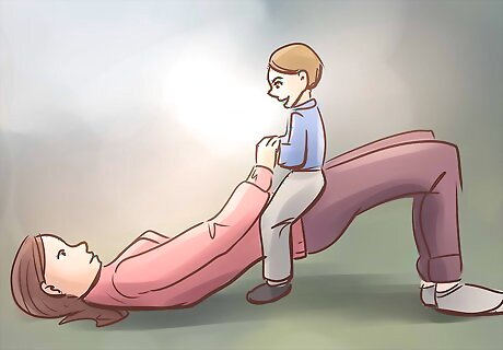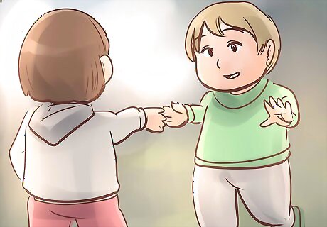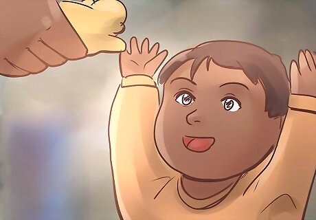 Give your baby a hand. As your baby develops their gross and fine motor skills there will be lots of times they will need you to help them pull up, balance, or just hold their hand. Give your baby the support they need to develop physically. Let your baby hone their fine motor skills by giving them your finger (or nose) to grasp. Let your baby use you to pull themselves up when they start to stand. Remember that your baby will also use other things besides you to be active. Be careful when you leave your baby alone. For example, a baby starting to walk will use the edges of tables, chairs, and other nearby furniture and objects to help them stand and push off from.