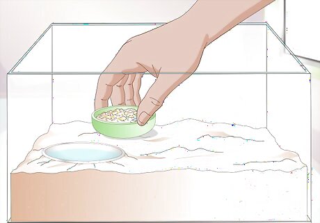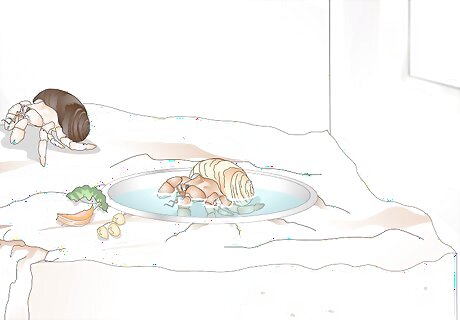 Place food and water dishes in the isolation tank. When molting, hermit crabs will need food that is high in calcium. Some good options might be cuttlebones, sea biscuits, or sand dollars. In the water dish, the usual dechlorinated tap water is fine. You might consider putting a bit of saline water in with their normal water, though, as the crab will be craving a little more salt than usual after their molt.