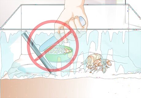Avoid cleaning your isolation tank unless it is empty. Hermit crabs will actually eat most or all of the exoskeleton they shed when they molt, so cleaning up after them is a minimal process. To avoid unnecessarily disturbing a molting crab, don’t clean the isolation tank unless there are no crabs in it. To clean it after returning a molted crab to the primary tank, simply clean out any leftover exoskeleton pieces, and stir up the sand a bit. Add a little water if necessary to retain the necessary consistency. This kind of cleaning should be done every three months or so.