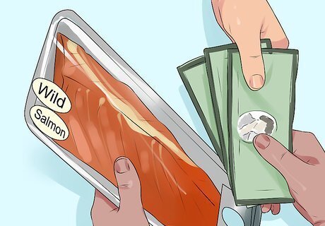 Buy wild salmon rather than farmed salmon. Though farmed salmon does indeed contain omega-3 fatty acids, it's overall less nutritious than wild salmon—for example, it contains only an eighth as much vitamin D, and only a third as much vitamin A. It's also fattier, meaning that it collects and stores significantly more contaminants and toxins than its wild counterpart does. Many places, such as the E.U. and the U.S., require manufacturers to label farmed and wild fish, as well as to identify whether or not dye has been added. In other places though, like Canada, this explicit indication is not required by law.
