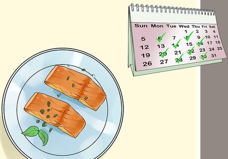 Eat two portions of oily fish every week. Many governments recommend that people eat more oily fish every week for the long-chain omega-3 fatty acids, and there's evidence that consuming actual fish benefits pregnant people more than taking supplements does. Examples of oily fish include mackerel, salmon, trout, herring, anchovies, and sardines. Tinned/canned tuna, cod, and haddock are, in contrast, not oily fish. A serving size of oily fish consists of 3.5 ounces (100 g).