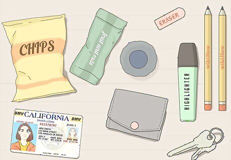 Get your bag of allowed items together the night before the test. You are allowed to bring a ziplock bag up to 1 gallon (3.79 liters) with you to the testing center. The test supervisor will examine your bag to make sure it includes no prohibited items. You are allowed to bring: A valid, government-issued photo ID Your wallet Your keys or a car-key fob (provided it doesn't have a data port) Feminine hygiene or medical products No. 2 or HB pencils (no mechanical pencils allowed) A highlighter An eraser (no mechanical erasers) A pencil sharpener Tissues A beverage and snack for break. Your beverage must be in a plastic container or juice box. Metal cans are prohibited.Warning: All electronic devices are prohibited. This includes smartphones, tablets, smartwatches, and e-cigarette devices. You may wear an analog watch, provided it doesn't have a stopwatch feature.