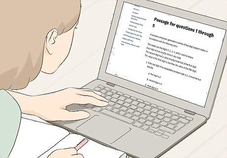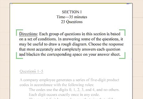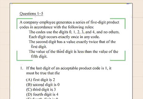 Read each passage or set of conditions actively. If you're taking the test on paper, mark up your test booklet. Circle transitional words, such as "although" or "however." In a set of conditions for the analytical or logical reasoning sections, underline words such as "always" or "never" that describe a required relationship. Take a couple of minutes to carefully read the passage or set of conditions before you dive into the questions. In the analytical or logical reasoning sections, make notes sketching out what you know based on the set of conditions. For example, if you have a question asking you to put a set of people or items in order based on the given conditions, you might be able to work out a basic order from the conditions. This will make it quicker and easier for you to answer the questions.Tip: Avoid picking an answer just because it's a true statement. Read all of the possible answers and select the one that best answers the question posed.