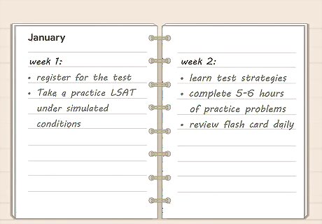 Set up a study plan over the course of several months. The LSAT tests your thinking skills — not acquired knowledge. It's not a test that you can cram for. Instead, you need to study consistently over the course of at least 3 to 4 months so you become familiar with the themes and types of questions asked. There are 3 types of sections on the LSAT: reading comprehension, analytical reasoning, and logical reasoning. There are always 2 sections of logical reasoning, so you want to spend the bulk of your study time on that section. Plan on spending at least 4 to 6 hours each week for 3 to 4 months studying for the test. You also want to plan practice tests on weekends. For example, you might spend 1 hour on Monday studying reading comprehension questions, 1 hour on Wednesday studying analytical reasoning questions, then 2 hours on Thursday studying logical reasoning questions. Then, on Saturday, you could take a 3-hour practice test.