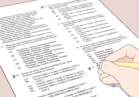 Maximize your time by skipping difficult questions. If you sense that a question is taking you too long to answer, skip it and go to the next question. If you answer the questions that are easiest for you first, you can go back at the end and pick up the difficult ones. This can keep you from getting stuck on a question. If you stay too long on one question, it's easy to get bogged down and frustrated. If you start to feel your frustration level rising, move on to the next question and go back to that one when you can approach it with a calm and even mind. It's also possible that as you go along, you'll recognize the best way to approach the question you skipped so you can go back and finish it.