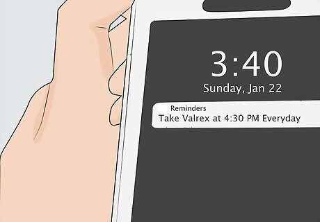 Take Valacyclovir at the same time each day. Unlike some medications, Valtrex doesn’t need to be taken at mealtime. However, you do need to take it at the same times each day in order for the medication to work properly. Take Valtrex at the same times every day, whether you’re taking 2 or 3 doses daily. For example, try taking it once with breakfast, once with lunch, and once with dinner. If you find that taking Valacyclovir on an empty stomach gives you a stomachache, try taking it with a meal. Or, you could eat a small snack (e.g., a granola bar) when you take the medication.