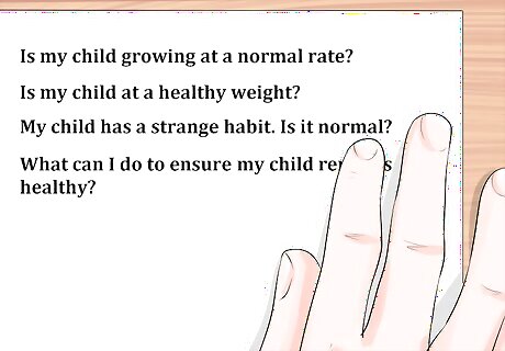 Prepare a list of questions. If you have questions about your child’s health, you should feel free to ask them when you take your child for a back to school checkup. For instance, you might want to ask your child’s doctor: Is my child growing at a normal rate? Is my child at a healthy weight? My child has a strange habit. Is it normal? What can I do to ensure my child remains healthy?